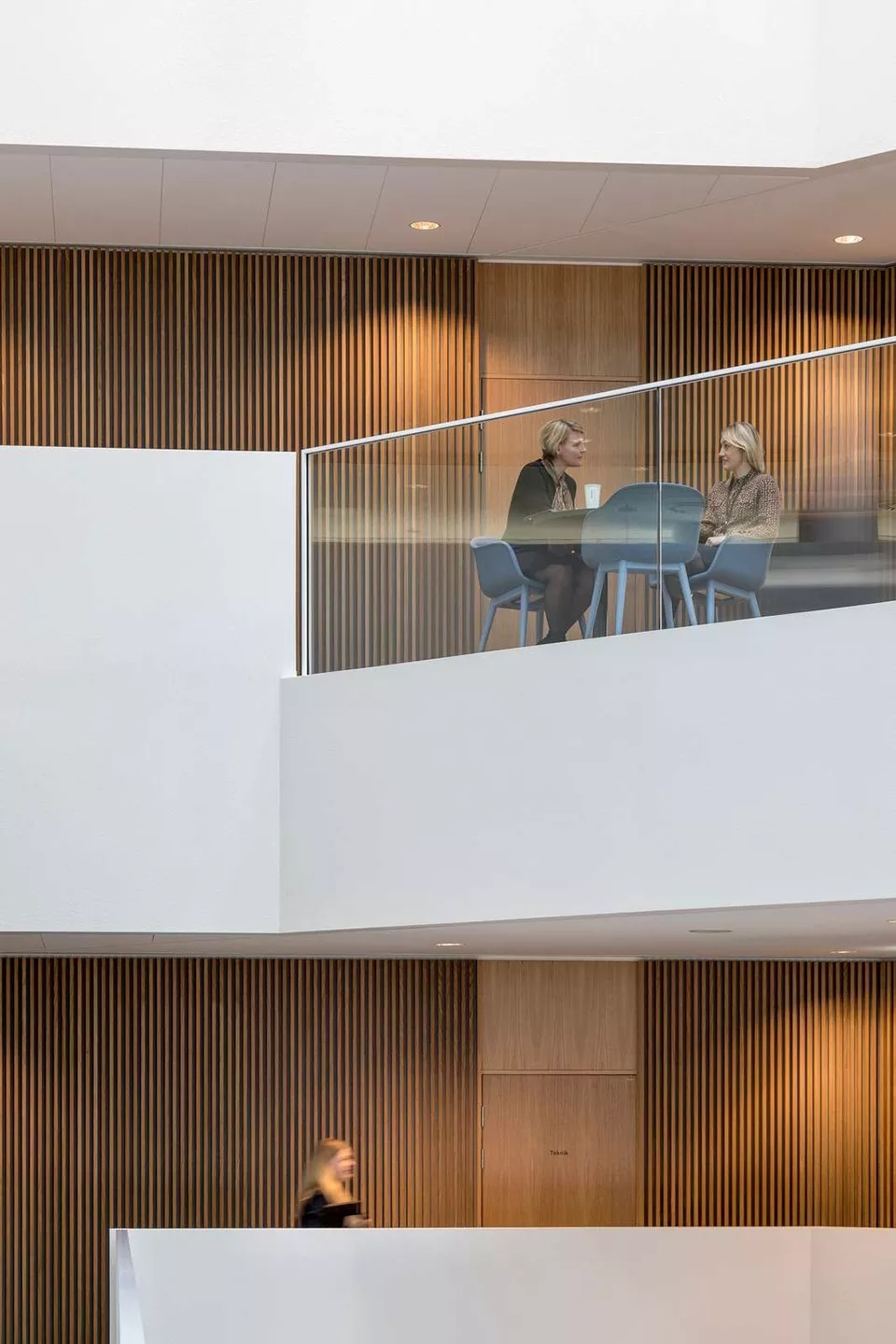 陽臺區(qū)域位于建筑立面和開放式中庭空間之間,設計師在這里布置了咖啡廳和非正式的工作區(qū)。其中的小型圍合空間也是整個組織內(nèi)部知識交流的重要空間,員工在這里可以通過遠程設備與更多同事會面交談。