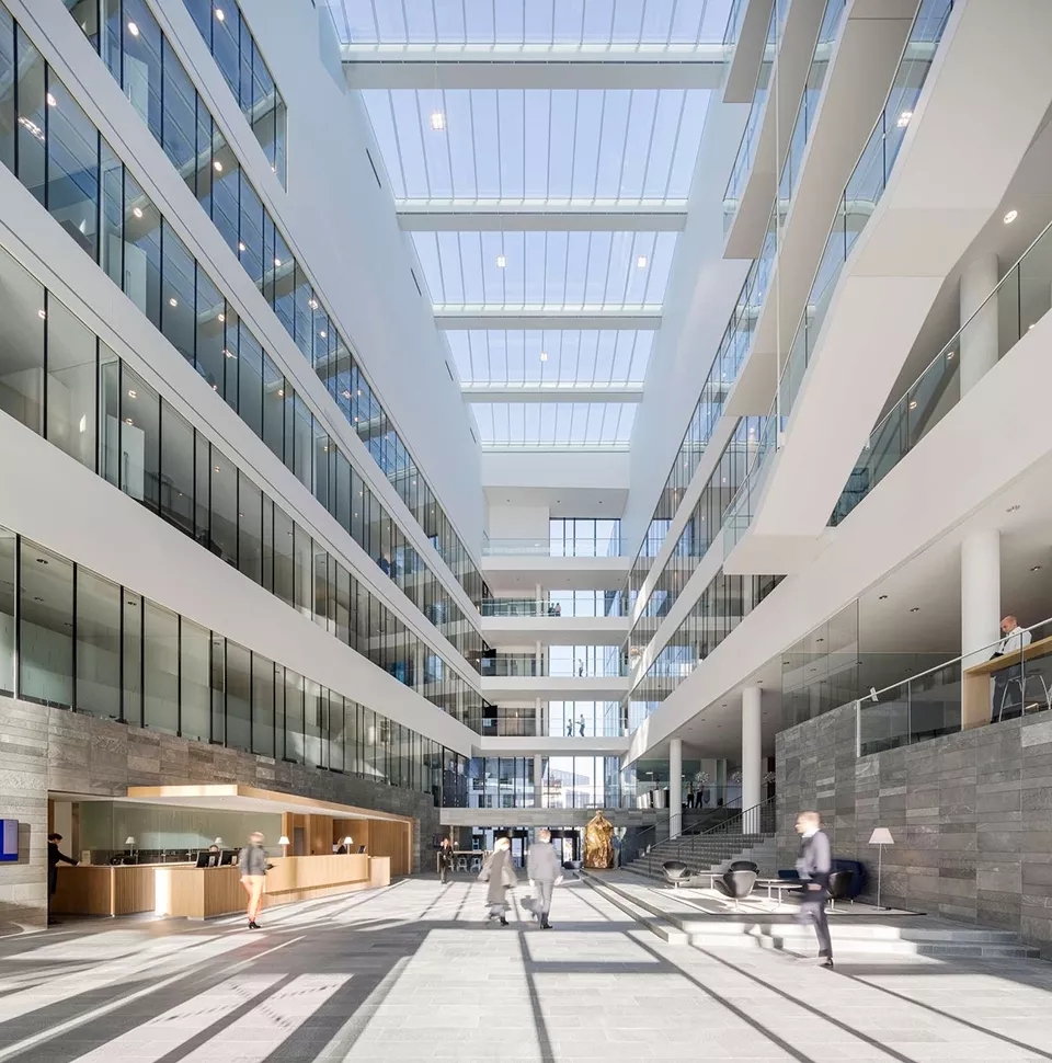 Nordea新總部擁有兩個令人難忘的中庭空間。其中一間為斯堪的納維亞半島最大的交易大廳,可容納 600名交易員,并可以觀賞到AmagerFælled的自然風光。而另一間中庭則成為了客戶與員工之間的互動場所。兩個中庭的區(qū)域讓建筑變得開放自由,如同城市中的公共空間,人們在這里相遇、共進午餐以及參加非正式會議,同時也是各個部門開展內(nèi)部活動的好地方。