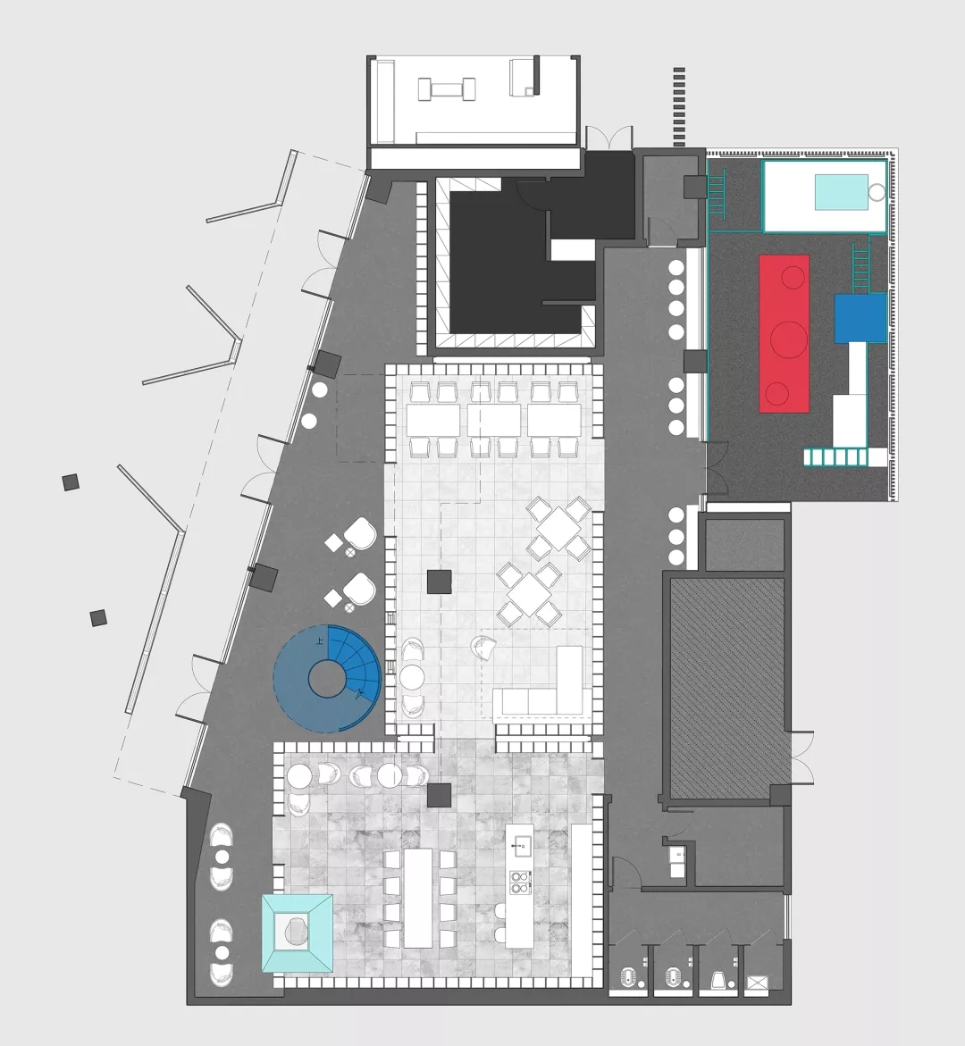 現(xiàn)場是個不規(guī)則的平面,如果排除未來可復制性,就著形狀設計并無不可,但這就缺乏了示范性意義。設計師按照客廳研究成果,在這個不規(guī)則平面最大極限設置了三個盒子,一個是功能性的,一個是社交性的,一個是女性的。如果把不規(guī)則的場地看成是一座城,這三個盒子就是內(nèi)城,而他們之間不規(guī)則的剩余空間可以自由定義的場所。