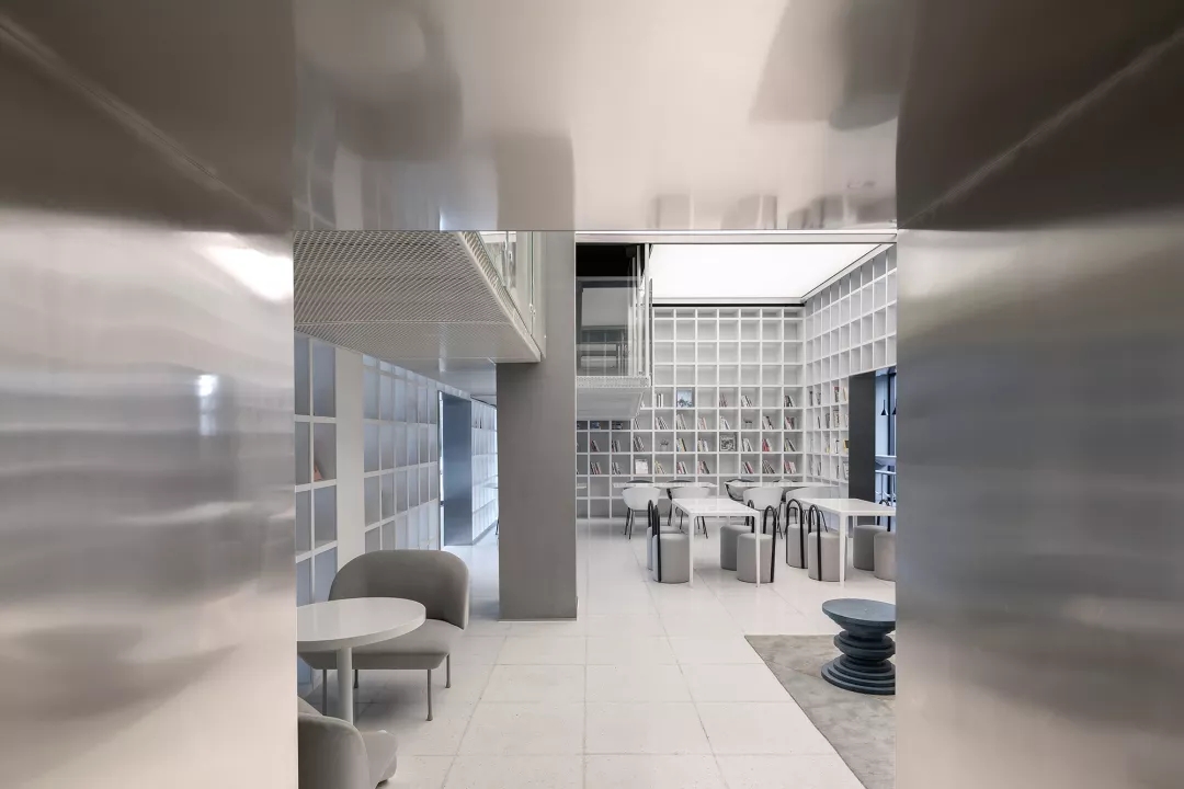 我用蒂芬妮藍閱讀屋作為女性盒子的中心,與此呼應的是入口可見的卡萊茵藍螺旋樓梯,以及盒子背面室外的明黃色兒童活動場地。他們精致地鑲嵌在有些迷離模糊的空間中成為點睛之筆。如果社區(qū)客廳藏在陳詞濫調(diào)的商業(yè)里面之后,就失去了示范作用。有空客廳的立面就是一個打開的盒子,高4米的半開門是穿孔鋁板制作的,形成了Wutopia Lab標志性的半透明界面。你能從這里隱隱約約的窺看到,溫暖的燈光,明亮的藍色,和孩子的笑聲。