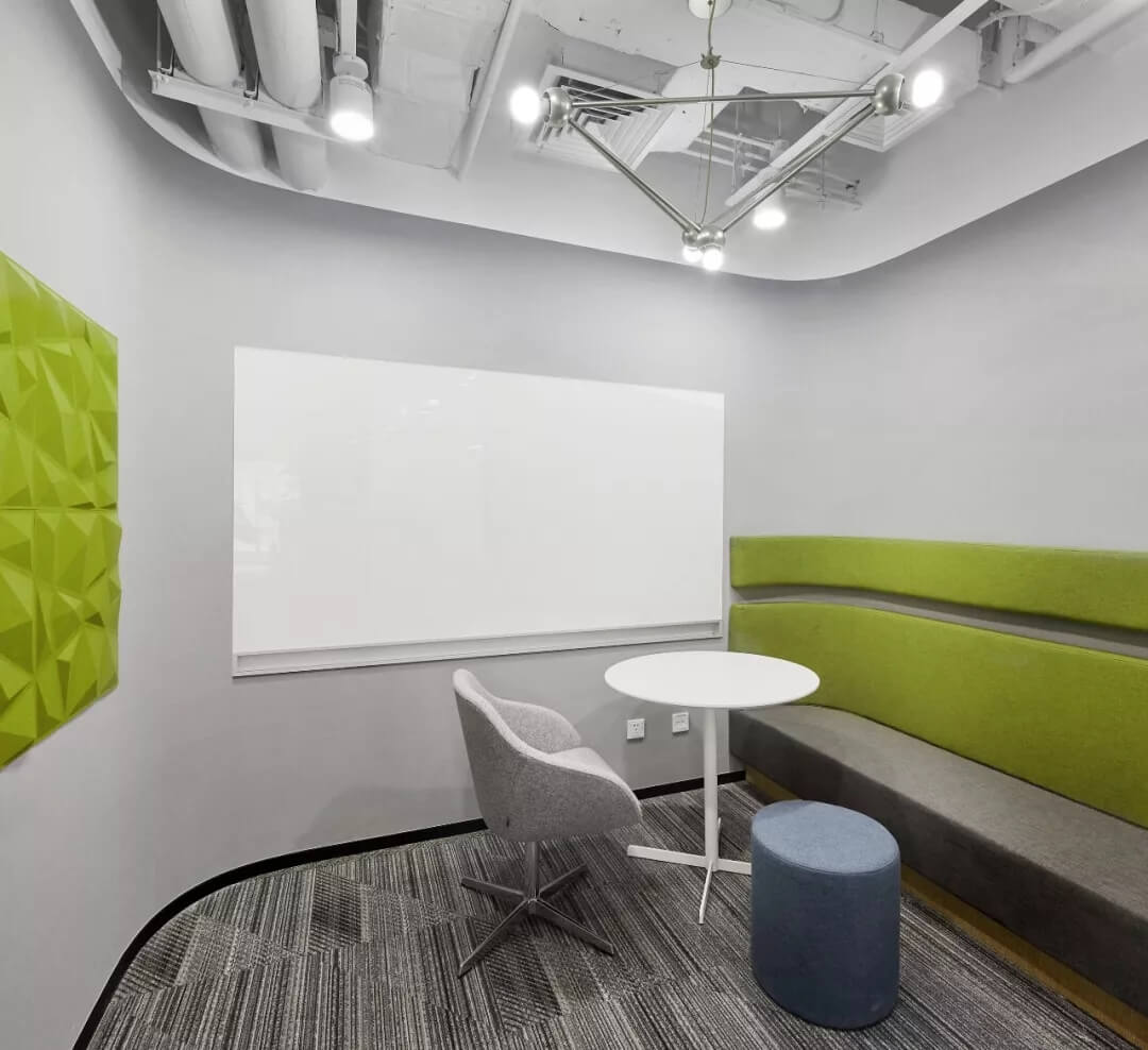 在軟裝設(shè)計上,該區(qū)域家具軟裝及墻壁,選擇明快的色調(diào),展示青春活力,并且用黑色烤漆玻璃內(nèi)嵌燈帶的方式營造氛圍,透著數(shù)字化和科技感,表現(xiàn)商湯在數(shù)字時代的不同場景中,所呈現(xiàn)的多元化和創(chuàng)新性。