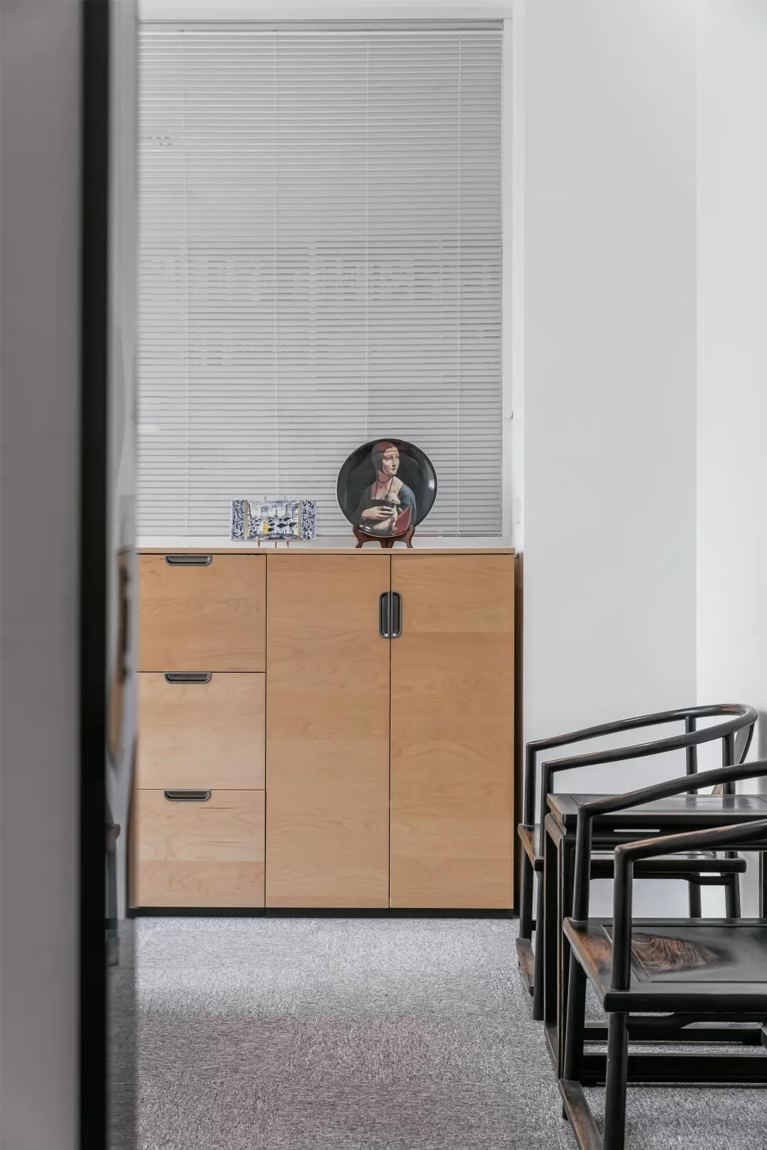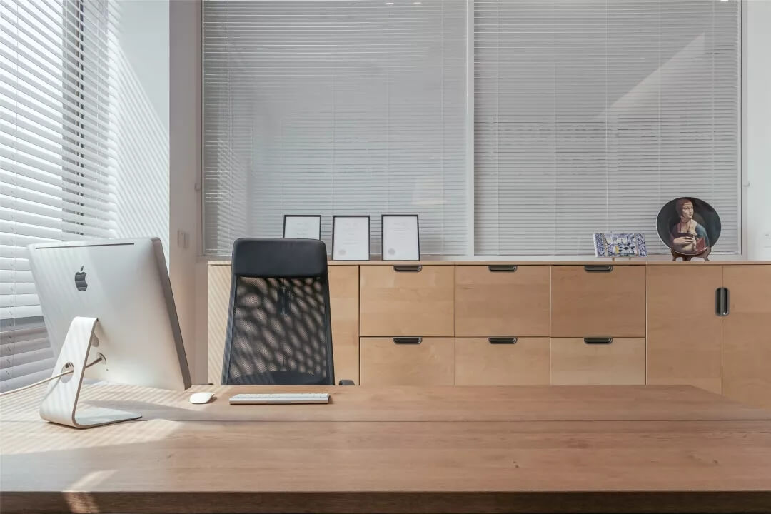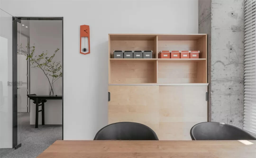 自由無拘的溝通對(duì)于團(tuán)隊(duì)的創(chuàng)新至關(guān)重要。開放的辦公區(qū)是有效獲取信息和激發(fā)靈感的地方。百葉窗折射的光影,充足的自然光營(yíng)造高效的工作環(huán)境??臻g雖然有限,但發(fā)揮最大的性能,開辟出一整面的軟裝材料搭配區(qū)。