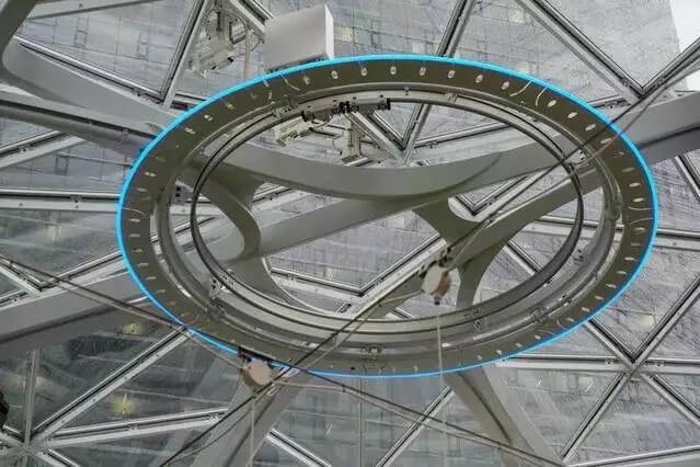 Spheres鳥瞰圖 The Spheres 由三個(gè)玻璃球狀建筑物組成,最大的球體高 90 英尺(約 27 米),寬 130 英尺(約 40 米)