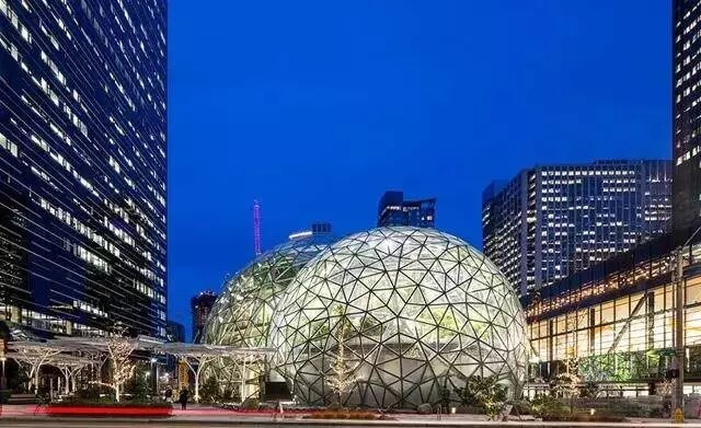 亞馬遜最新總部坐落在西雅圖商業(yè)區(qū),高達(dá)四層,是座熱帶雨林般的溫室建筑,由玻璃和白色鋼筋建造而成,老板杰夫·貝佐斯(Jeff Bezos)站在頂樓招呼員工。