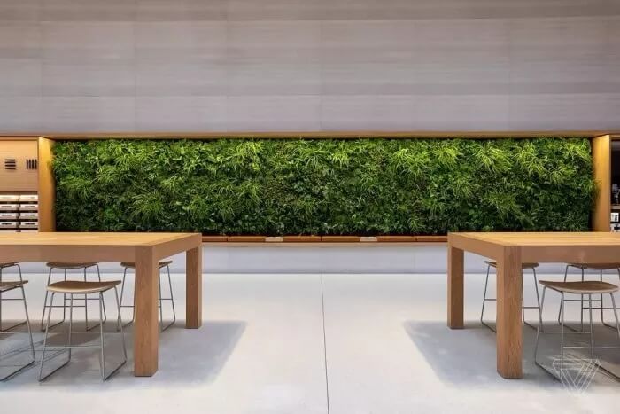 店內(nèi)仍保留蘋果店專屬長(zhǎng)木桌,但與之前不同的是新增加了大量綠植,提升了空間的親近感。