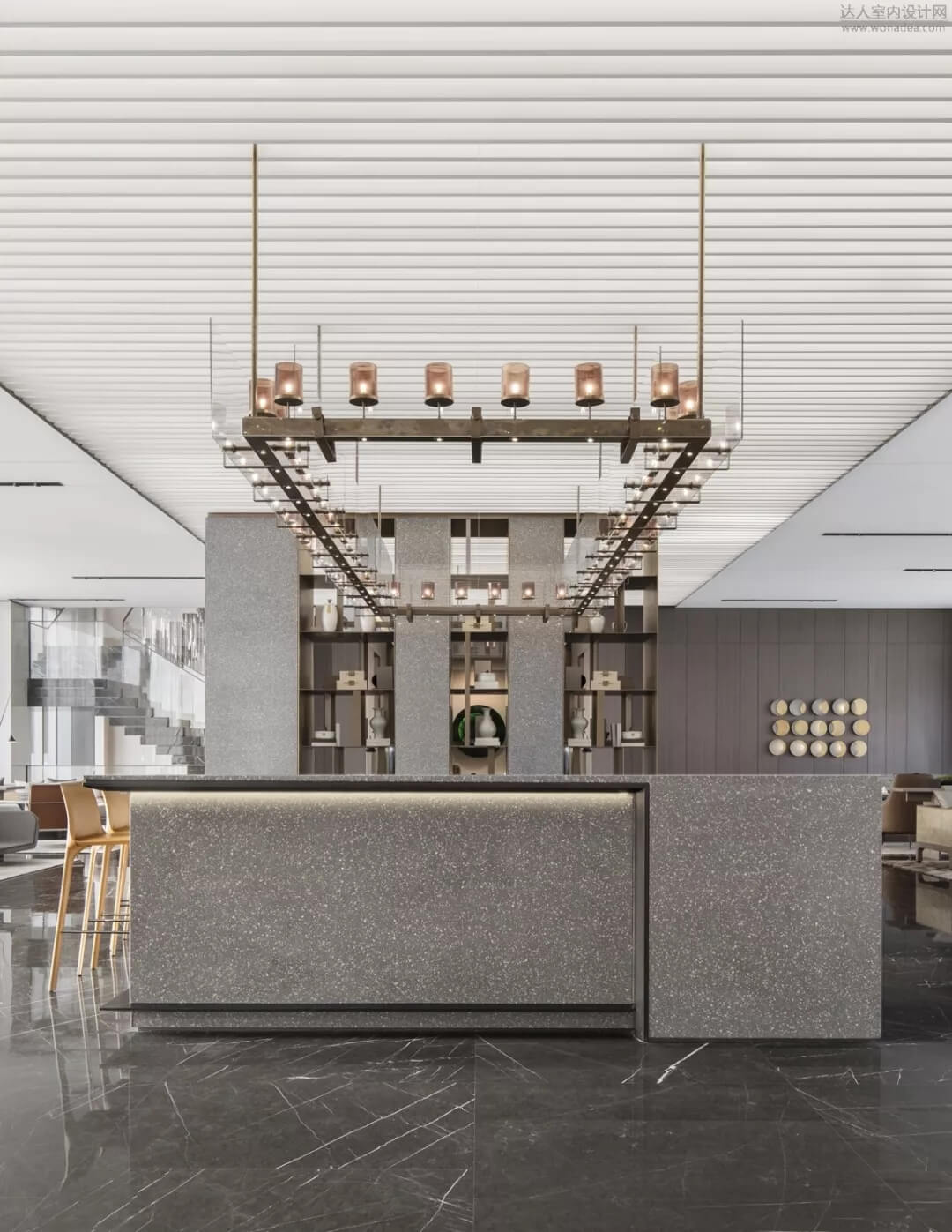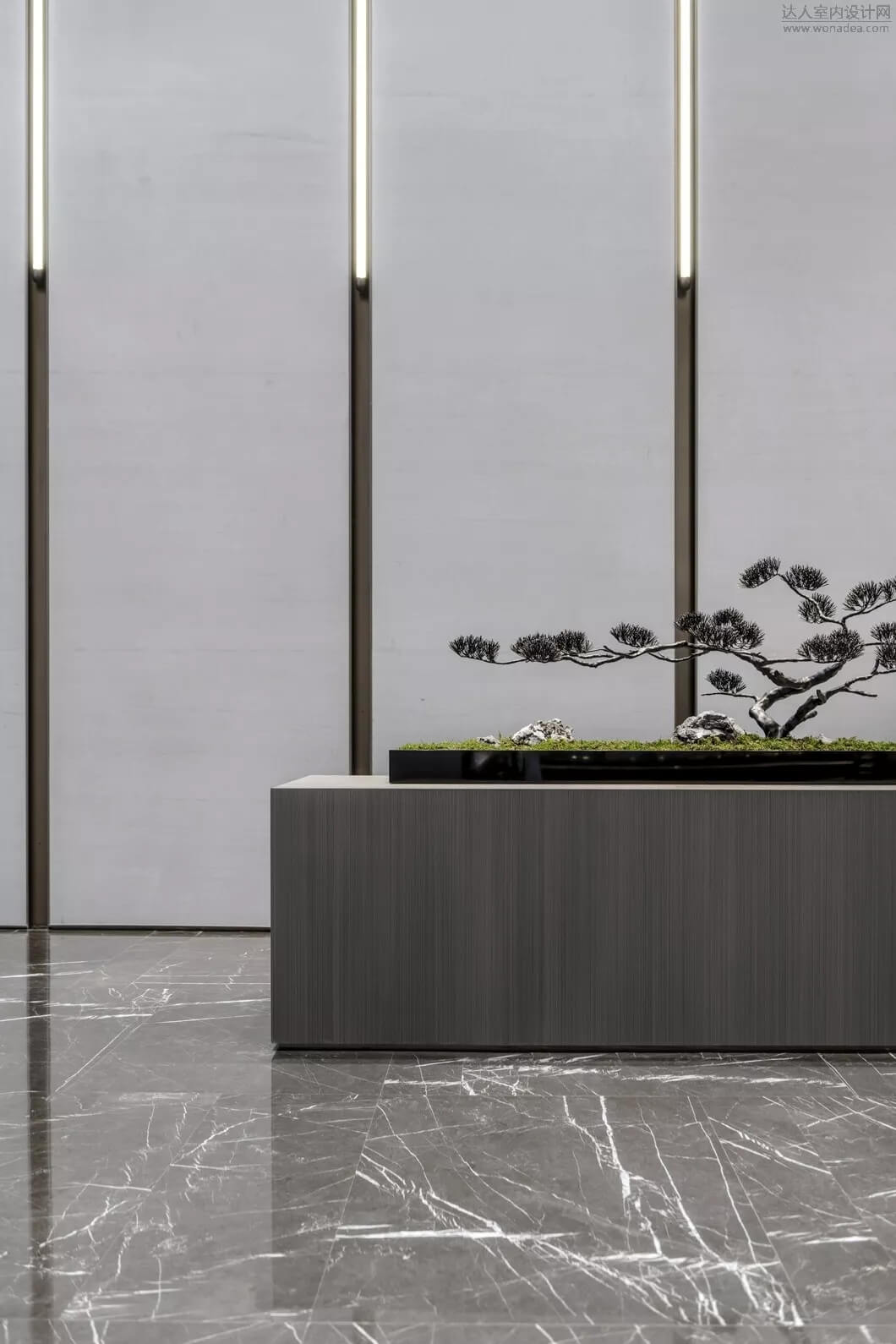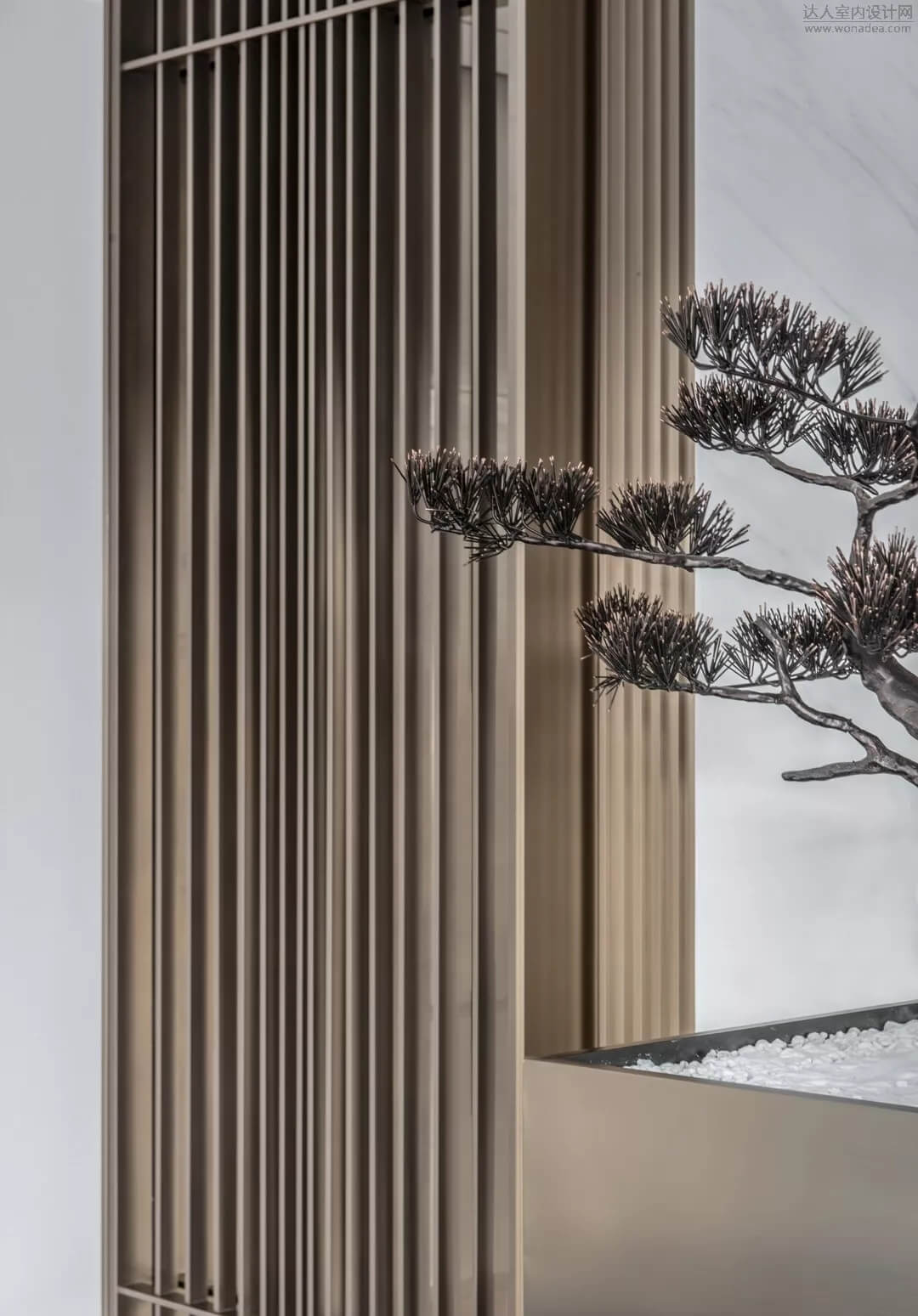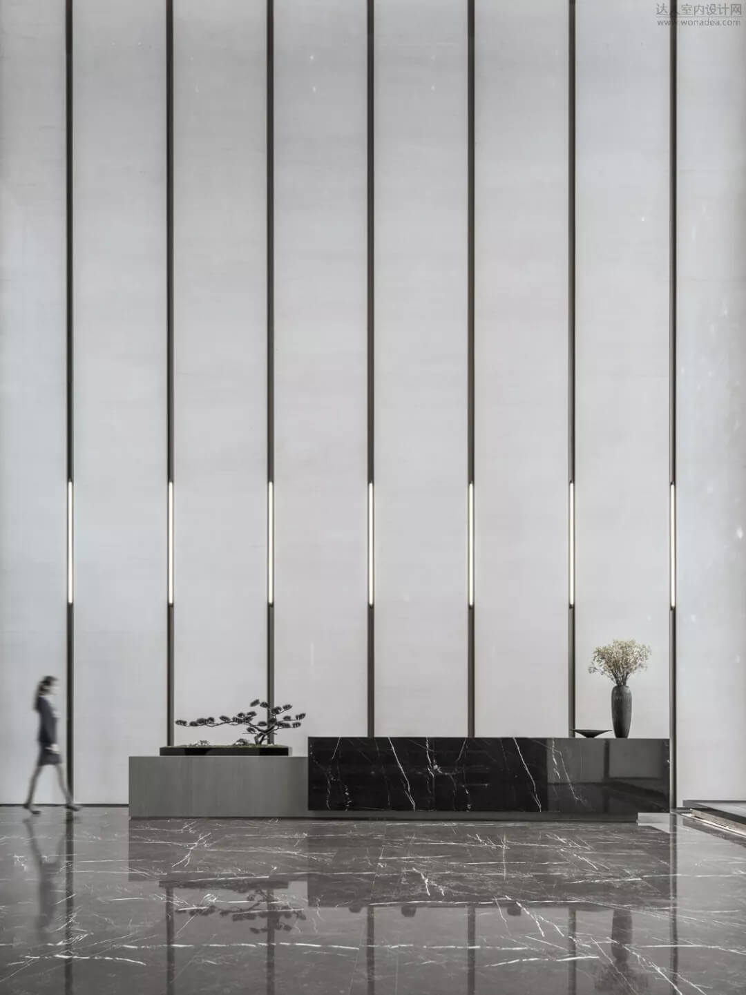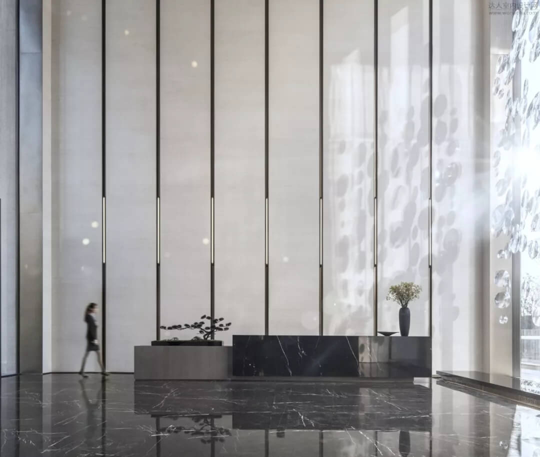 通過(guò)豐富的景觀區(qū)進(jìn)入門(mén)廳,感受到空間的空靈,立面設(shè)計(jì)過(guò)濾了來(lái)自于外界的繁復(fù)。十米挑空的大廳,墻面以米色砂巖為基底,黃銅色金屬?gòu)?qiáng)化縱向的比例,凸顯出空間的氣勢(shì)。入口對(duì)景設(shè)置的水景讓穿梭其中的訪客仿若能傾聽(tīng)到潺潺水聲,同時(shí)水景和懸掛的軟裝裝置相得益彰,充滿巧妙的用意,同時(shí)也分隔了挑高通透的玻璃幕墻,虛實(shí)結(jié)合,體現(xiàn)現(xiàn)代設(shè)計(jì)的東方神韻。