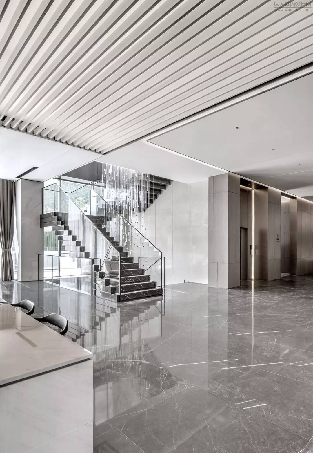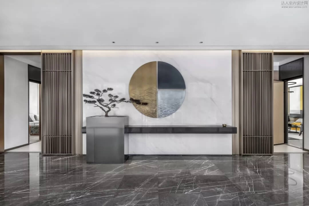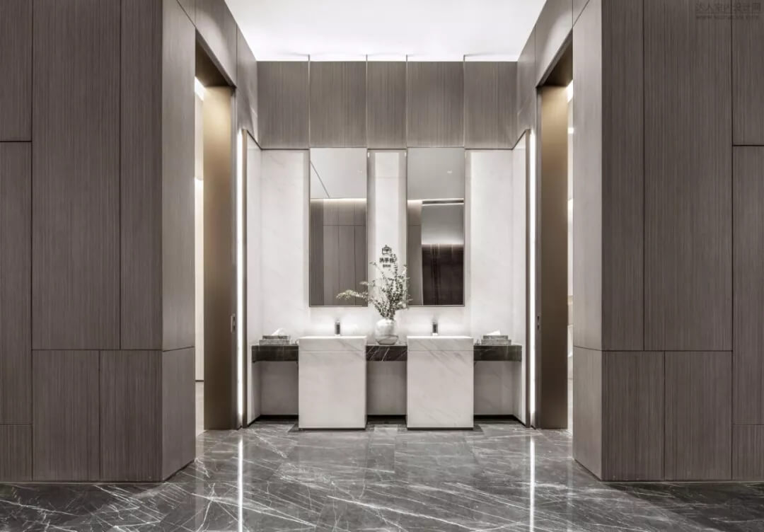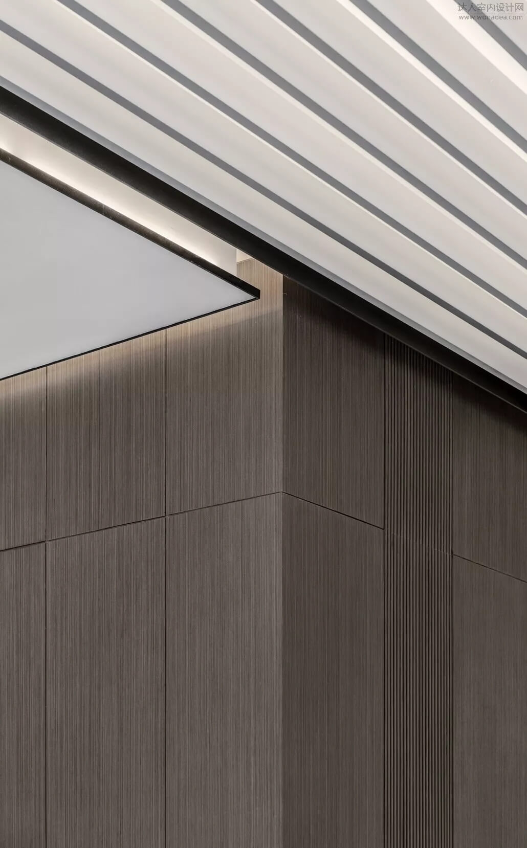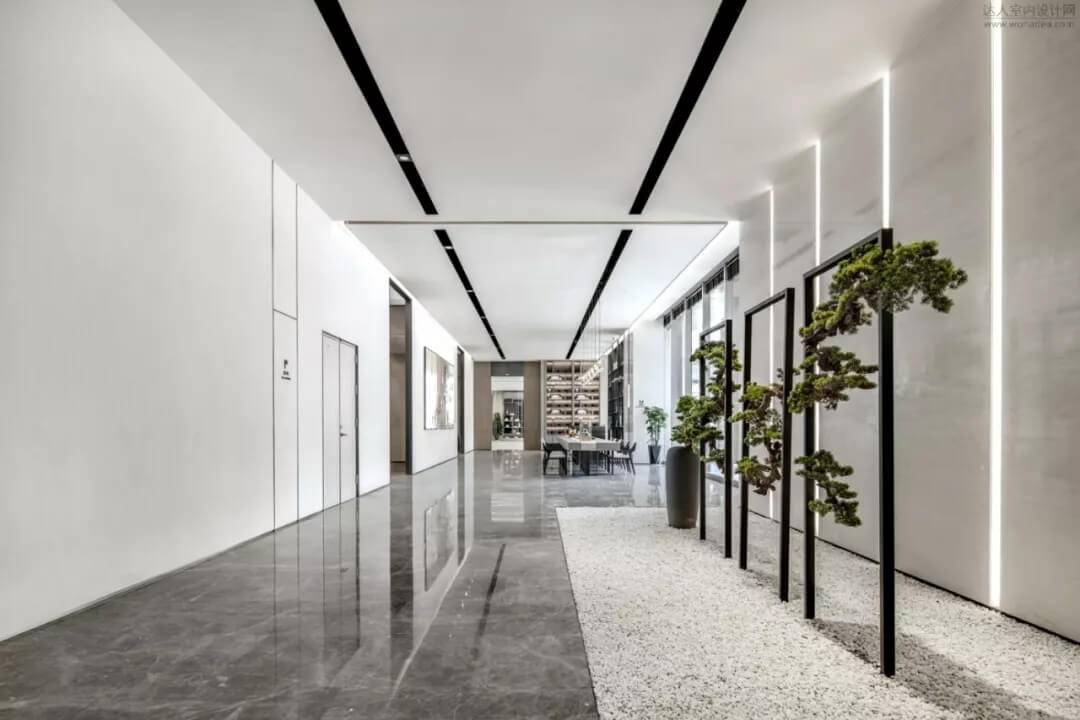 通過(guò)豐富的景觀區(qū)進(jìn)入門(mén)廳,感受到空間的空靈,立面設(shè)計(jì)過(guò)濾了來(lái)自于外界的繁復(fù)。十米挑空的大廳,墻面以米色砂巖為基底,黃銅色金屬?gòu)?qiáng)化縱向的比例,凸顯出空間的氣勢(shì)。入口對(duì)景設(shè)置的水景讓穿梭其中的訪客仿若能傾聽(tīng)到潺潺水聲,同時(shí)水景和懸掛的軟裝裝置相得益彰,充滿巧妙的用意,同時(shí)也分隔了挑高通透的玻璃幕墻,虛實(shí)結(jié)合,體現(xiàn)現(xiàn)代設(shè)計(jì)的東方神韻。
