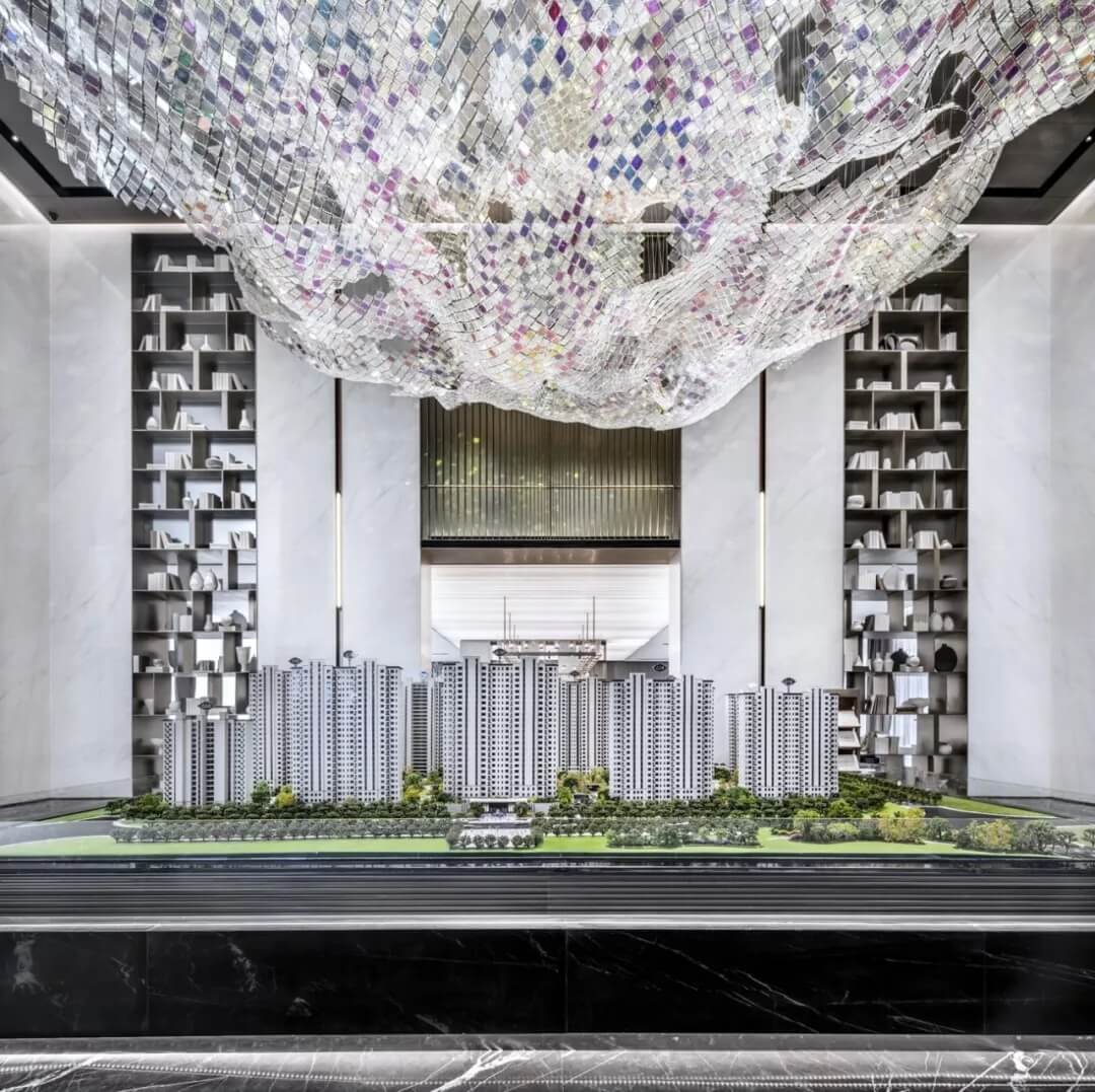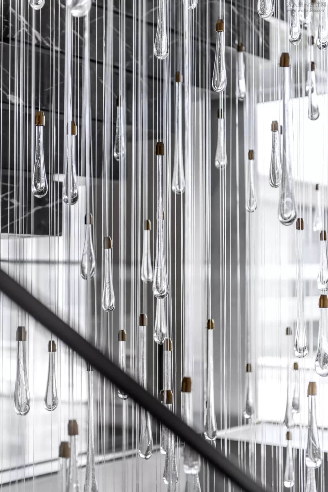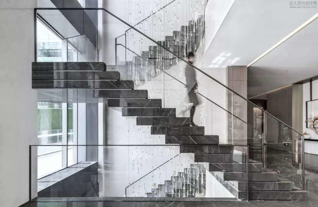 樓梯在空間中不僅是能上下的建筑物,將它打破序列重新解構(gòu),輕盈且厚重,構(gòu)成如雕塑般的能量,讓它成為連接售樓處和會(huì)所的藝術(shù)裝置。樓梯的鮮明特質(zhì)在精心設(shè)計(jì)下顯得非常令人矚目,結(jié)合樓梯下面的水景,讓空間賦有東方意境。