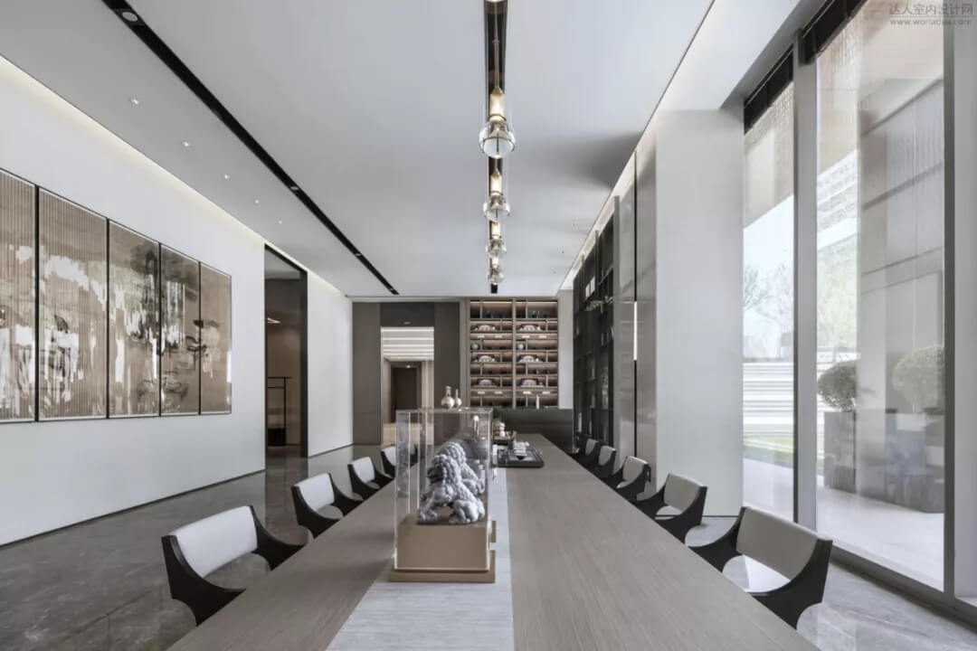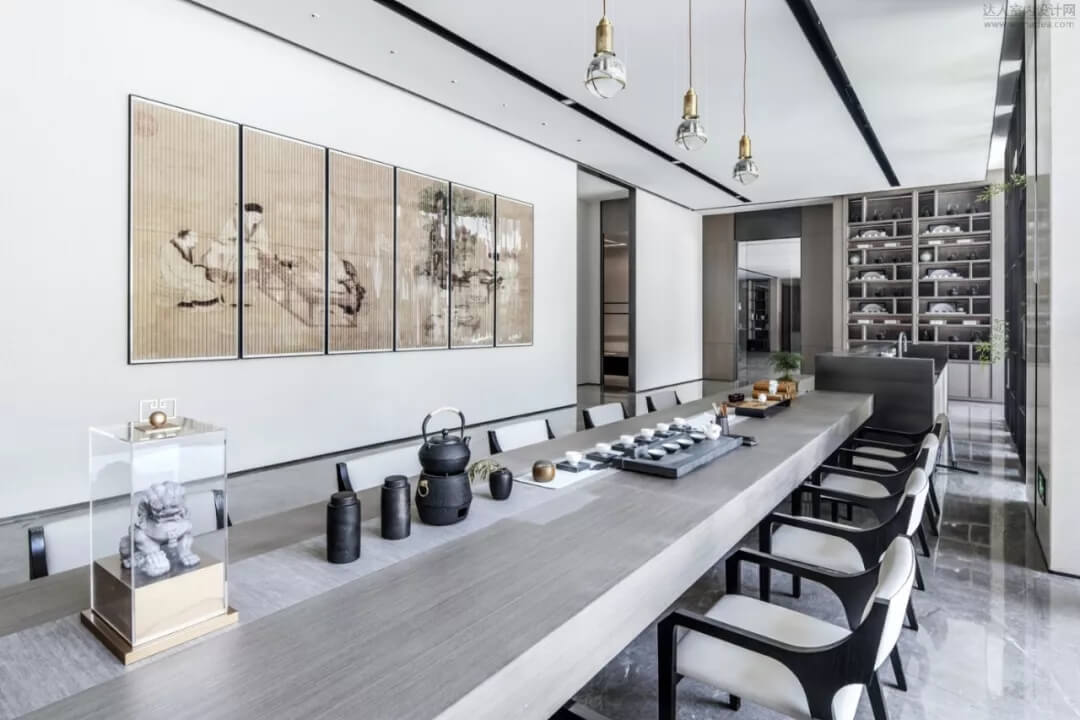 在會(huì)所品茶水吧臺(tái)區(qū)結(jié)合枯山水造景,色彩雅致內(nèi)斂,充分展現(xiàn)了中國(guó)人素來(lái)喜愛(ài)的‘靜’,同時(shí)超長(zhǎng)條的品茶臺(tái),利用下沉庭院的景觀和室內(nèi)產(chǎn)生了互動(dòng),模糊了室內(nèi)外的界限。藝術(shù)儀式感的空間給人帶來(lái)思考的余地。