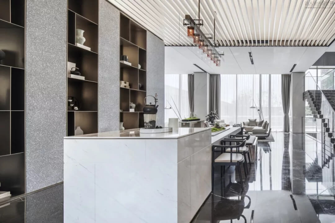 兩個(gè)吧臺(tái)相互穿插,水磨石和黃銅的材質(zhì)凸顯時(shí)尚感和品質(zhì)感,黃銅和水磨石是絕配,除了使用細(xì)銅條作為不同顏色的分割線,還可以用銅條增加藝術(shù)氣息,水磨石的可塑性在這種風(fēng)格中最為凸顯。天花條形背光燈帶設(shè)計(jì),現(xiàn)代空間豐富柔而輕盈。洽談區(qū)擺陳暖色為主,結(jié)合豐富的飾品擺放,使空間整體散發(fā)素凈淡雅的氣息,營(yíng)造一個(gè)對(duì)談、暖意漸生的生活場(chǎng)景,只需稍稍駐足,便能細(xì)品一首生活靜謐詩(shī)。
