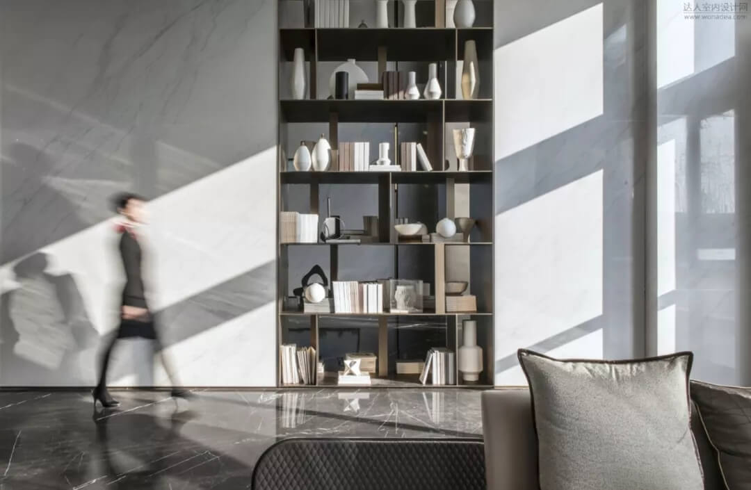 沙盤(pán)區(qū)墻面以大花白陶瓷板為主墻面,通過(guò)通高的黃銅書(shū)架體塊和金屬格柵,本身空間具有很強(qiáng)的中軸對(duì)稱(chēng)的儀式感,凸顯出空間的大氣。曼妙的波浪曲線,以流動(dòng)的韻律打破空間靜態(tài),同時(shí)從明亮空靈的大堂走入半圍合的沙盤(pán)區(qū),總能給人帶來(lái)新奇感,亦是詩(shī)意與藝術(shù)的格調(diào)升華。