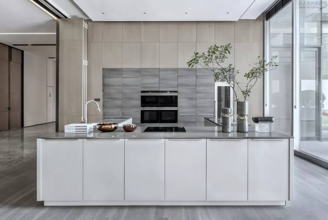 私宴,是以當(dāng)代設(shè)計(jì)來(lái)描繪文人飲酒時(shí)追求的清雅意境,寄情於山水。空間通過(guò)折疊門(mén)和西廚吧臺(tái)區(qū)產(chǎn)生互動(dòng),空間功能既獨(dú)立又有相互滲透。延續(xù)簡(jiǎn)潔流暢的線條,布置與空間密切配合。