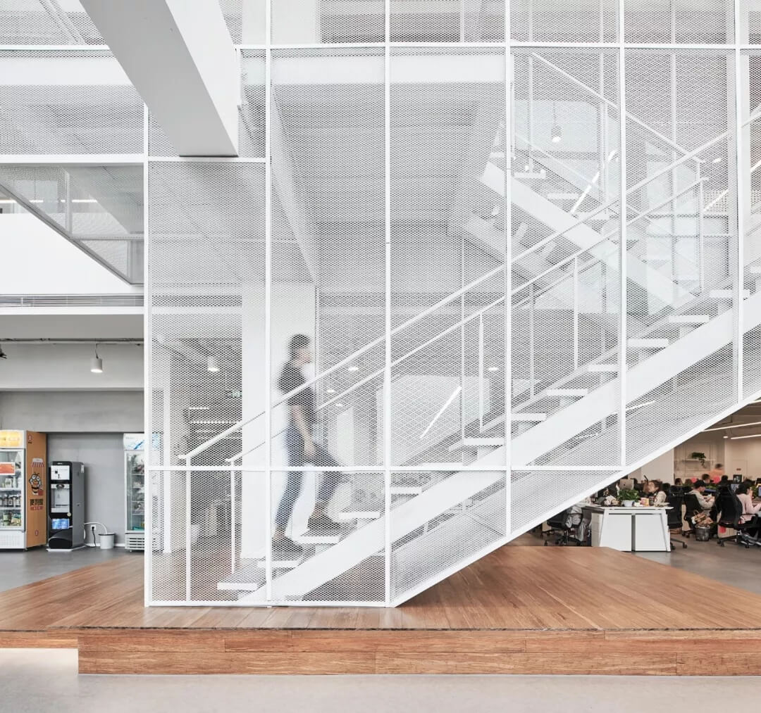 游廊藝谷島,設計師用鋼網構筑出具有雕塑藝術感的包裹樓梯空間,通透性的白色鋼網,簡單時尚,加強與空間的融合。