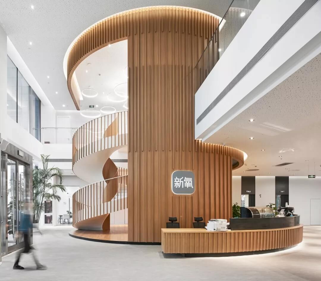 美麗生活館中最矚目的是兩個圓柱體空間模塊,一個是貫穿1-2層的木格柵旋轉樓梯,半開半包,與咖啡館及接待臺合嵌為一體,溫馨,時尚,樓梯的內側展示新氧的榮譽勛章;一個是透明的柱狀空間,以靜態(tài)裝置的方式展示新氧文化,周圍布置洽談交流座椅;大堂南側用文化墻隔出開放的休閑洽談區(qū)和面試及收發(fā)室的圍合空間。