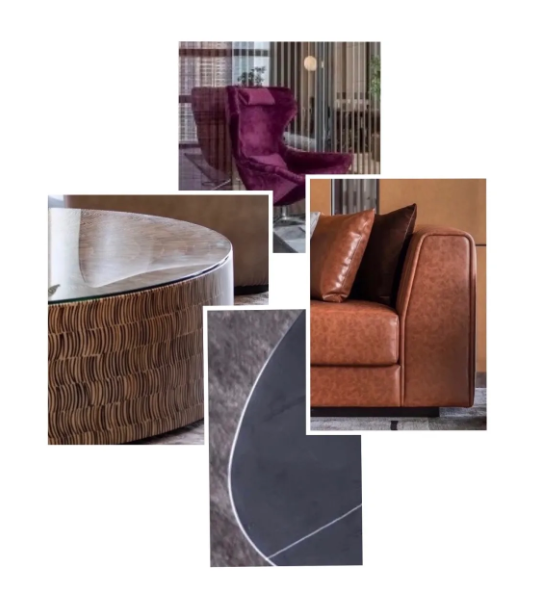 單椅大量使用皮革凸顯質感,同時在家具上通過黑鋼、木及玻璃等打造硬朗穩(wěn)重的商務格調。