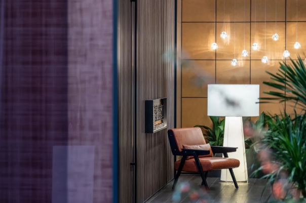 前廳一角,一把隨意的休閑椅構設出安靜而獨立的等候區(qū)。光是一味奇妙而誘惑的催化劑,見證格柵的參差錯落,旖旎于水滴狀通透吊燈,如同午夜巴黎那一杯令人情迷的威士忌,透過光影的變幻,實現(xiàn)精尚定調。