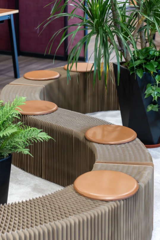 裝置互動區(qū),采用s型手風琴形態(tài)展示,可伸縮挪動,搭建起多人會客溝通的場景,在曲折回旋中梳理人文互動的脈絡。從初始到終結,代表五行木文化的綠植一前一后,維系場域間的平衡與沉穩(wěn)。
