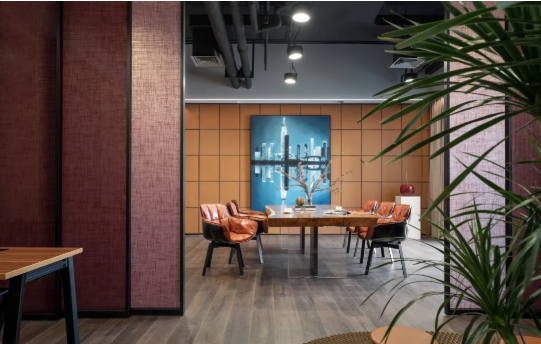 設計師認為辦公空間的設計也應該是溫暖的、充滿關愛的,通過空間的靈活切換為客戶創(chuàng)造更多的商業(yè)價值。墻面以磁性黑板漆穿插其間,實現(xiàn)視覺上的層次迭代。薄暮紫夾絲玻璃推拉門實現(xiàn)了會議室與辦公區(qū)的自由切換,開放式空間為來此進行房產咨詢的精英人士提供了線下答疑、培訓學習的平臺,成就雙方合作共贏的發(fā)展期待。