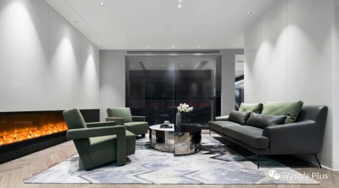 翡翠林梢青黛山,碧紗窗外水挪藍,淺色的空間融入灰綠色的軟裝,建筑與室內(nèi)的氣質(zhì)彌漫開來。定制的麂皮絨沙發(fā),鏡面金屬和白色石材拼接而成的茶幾,藝術(shù)感彰顯無遺。黑色漸變玻璃隔墻,既是背景墻又是空間顏色最深的立面,讓茶水間在保持通透的同時又保證會客區(qū)客人的私密性。壁爐,火焰,回歸自然的同時讓氛圍變得輕緩,香茗與咖啡,讓辦公空間散發(fā)著靈魂的香氣。