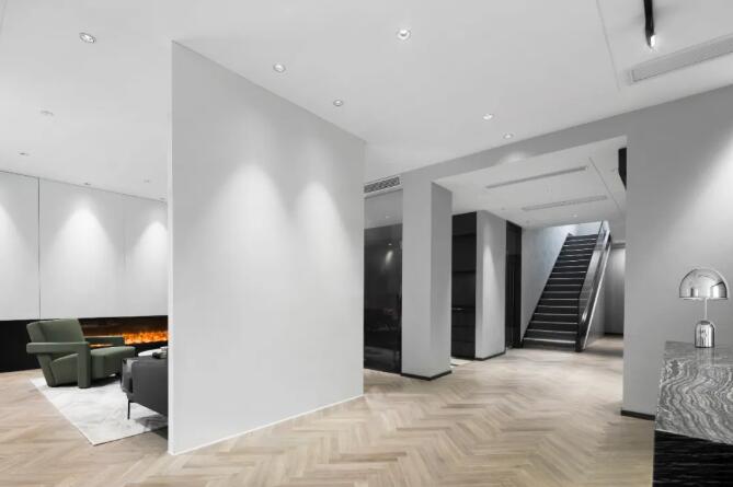 深色接待臺在白色的背景下顯得尤為安靜端莊。透過隔墻映入眼簾是會客區(qū)的壁爐一角、茶水間及小會議室。大面積白色混油木飾面讓空間擁有獨特的高貴氣質(zhì),突顯出集團年輕、激進向上的愿景。