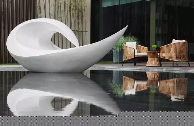 深灰色意大利火山石與柔和的沙發(fā)茶幾相得益彰,互為映襯。而光線照射進(jìn)來更是活躍了整個(gè)空間,落地窗外便是庭院。水景區(qū)域一只白天鵝正在梳理羽毛,而水畔一側(cè)的休息區(qū)域更是增添了一縷閑情逸致,營造一種靜謐愜意的氛圍。