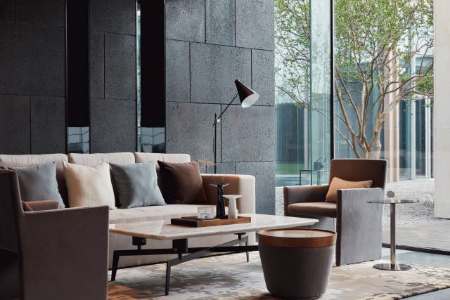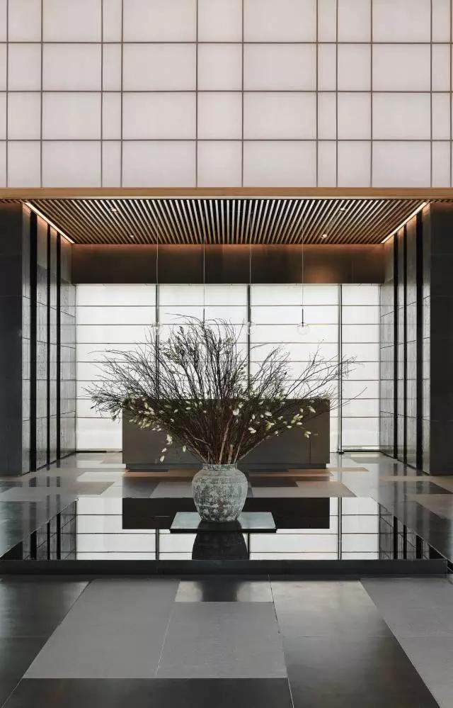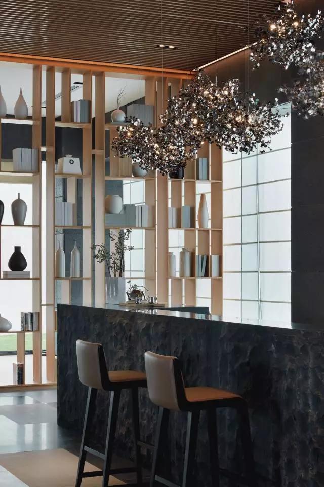 借由東方園林式的假山,打造出“未若柳絮因風(fēng)起”的雪景,美如水墨畫、細(xì)膩至極。這與圍繞式洽談方式布置相結(jié)合,巧妙處理好空間形態(tài)和陳設(shè)之間的關(guān)系。大尺度挑高設(shè)計(jì),加上頂部有序交互的線條,讓空間極具延展性,通透敞亮的照明效果搭配藝術(shù)性燈光點(diǎn)綴,使整體氛圍更顯大氣與品位。該空間通過主體、功能位置、通透的序列式的立面關(guān)系,自然分割空間視線,同時(shí)又實(shí)現(xiàn)了將光線引入到室內(nèi)的最大化。