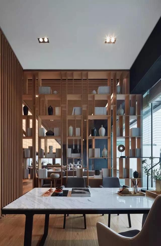 VIP區(qū)域原木色書架、豎向的木百葉有效阻隔區(qū)分空間,與周圍關(guān)系相互連接又互不打擾,形成半開放式的私密空間,整體保證了空間的互動(dòng)性與獨(dú)立性。在這個(gè)“書卷留白筆墨濃”的區(qū)域,營造出靜心一隅,構(gòu)筑具有人文氣息和品質(zhì)感的氛圍。