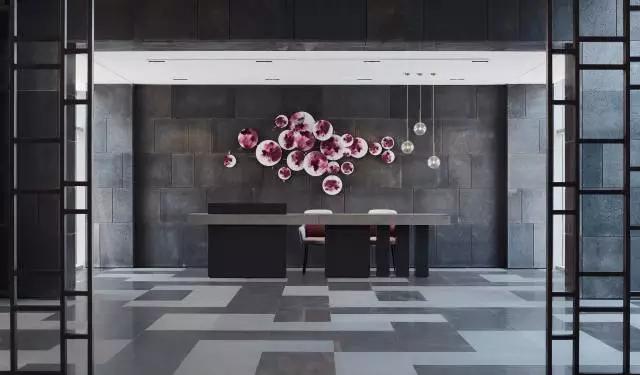預(yù)接待吧臺與大廳講究整體的對稱平衡,通過巧妙的吧臺構(gòu)成形式、空間吊燈的位置,呈現(xiàn)靈動(dòng)的立面關(guān)系,有效緩解空間的呆板。大面積深灰色石材,配以紫色壁飾花瓣式鋪灑開來,夾雜一絲神秘感,東方韻味無限彌散。