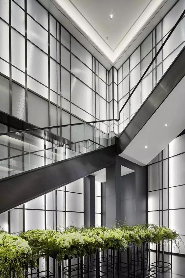 樓梯墻面引入“光線”的概念,設(shè)計(jì)上以簡(jiǎn)潔的橫豎向線條元素構(gòu)成,結(jié)合原建筑結(jié)構(gòu),充分發(fā)掘空間內(nèi)的建筑感。
