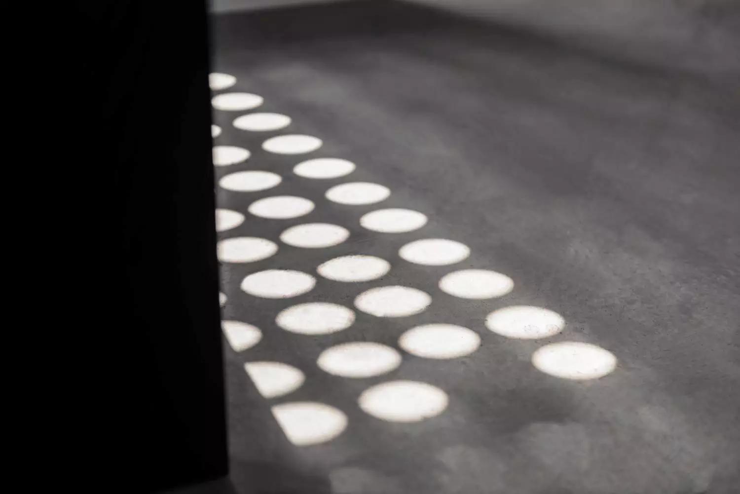 樓頂大小不一的圓孔讓自然光遊蕩在樓梯上,最大限度地借光入室。圓光束如同舞臺(tái)的聚光燈,它引導(dǎo)人們聚焦樓梯的肌理細(xì)部,也使人隨光前行、探究空間。