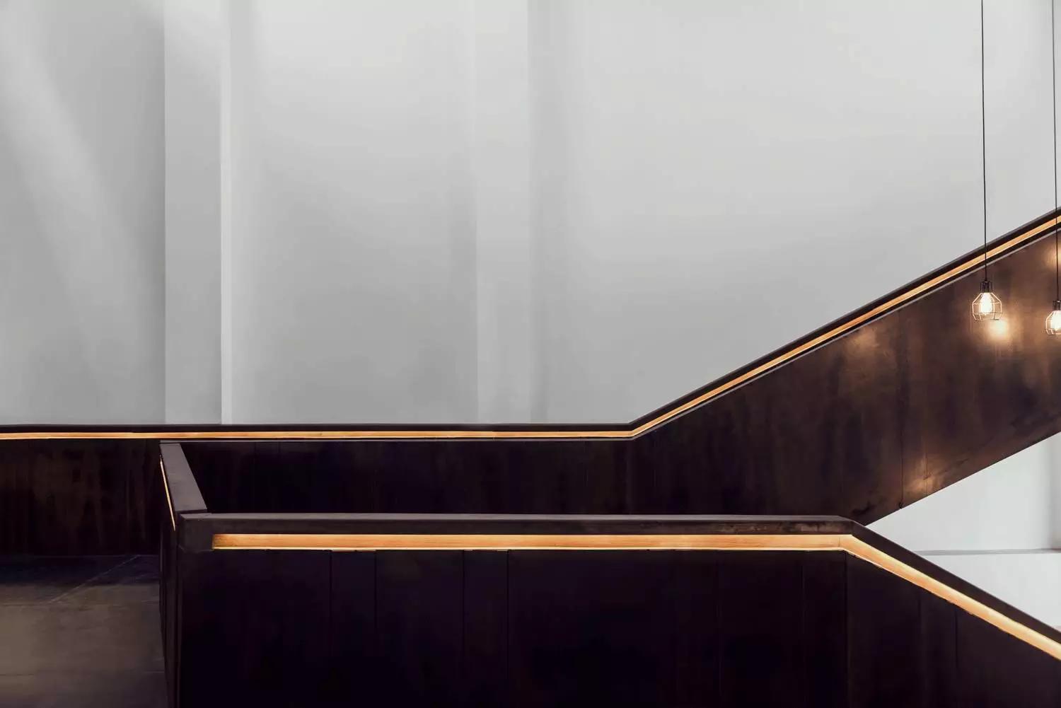 直線組合而成的吊燈利落的拉伸在樓梯中部,與不斷變化、充滿戲劇色彩的自然光互相補(bǔ)充,吊燈的照明使空間更平衡與緩和,穩(wěn)定了光影變化中的視覺感受。