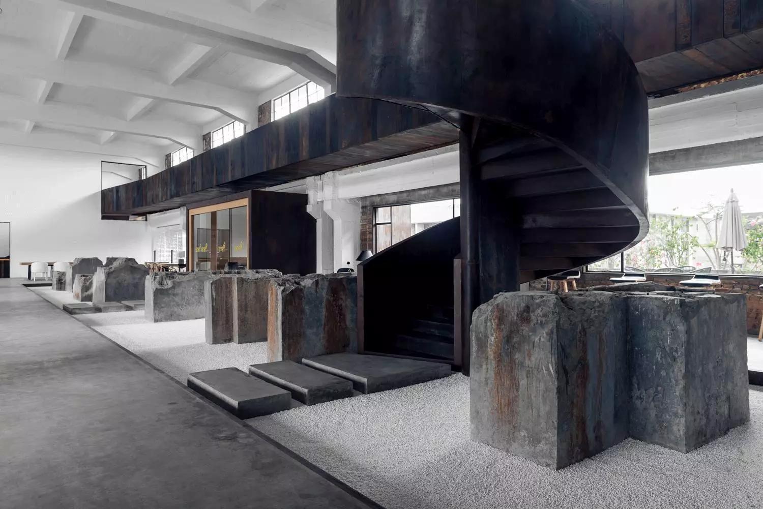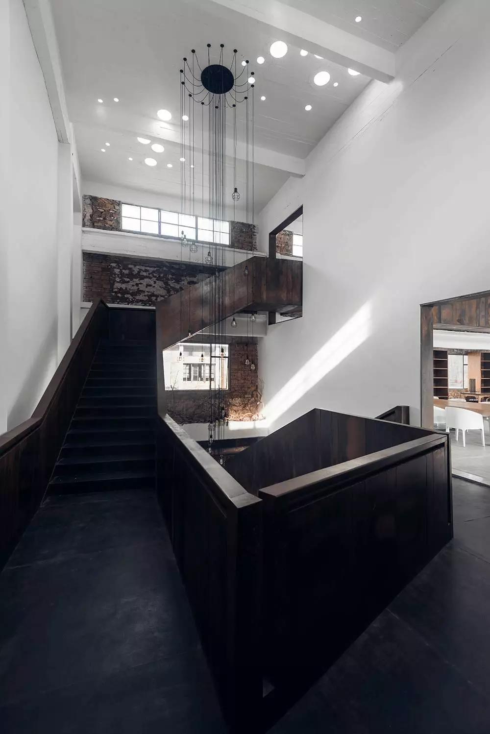 鐵質(zhì)樓梯像是舊體廠房生長出的枝椏,營造出強(qiáng)烈但不顯突兀的現(xiàn)代感。