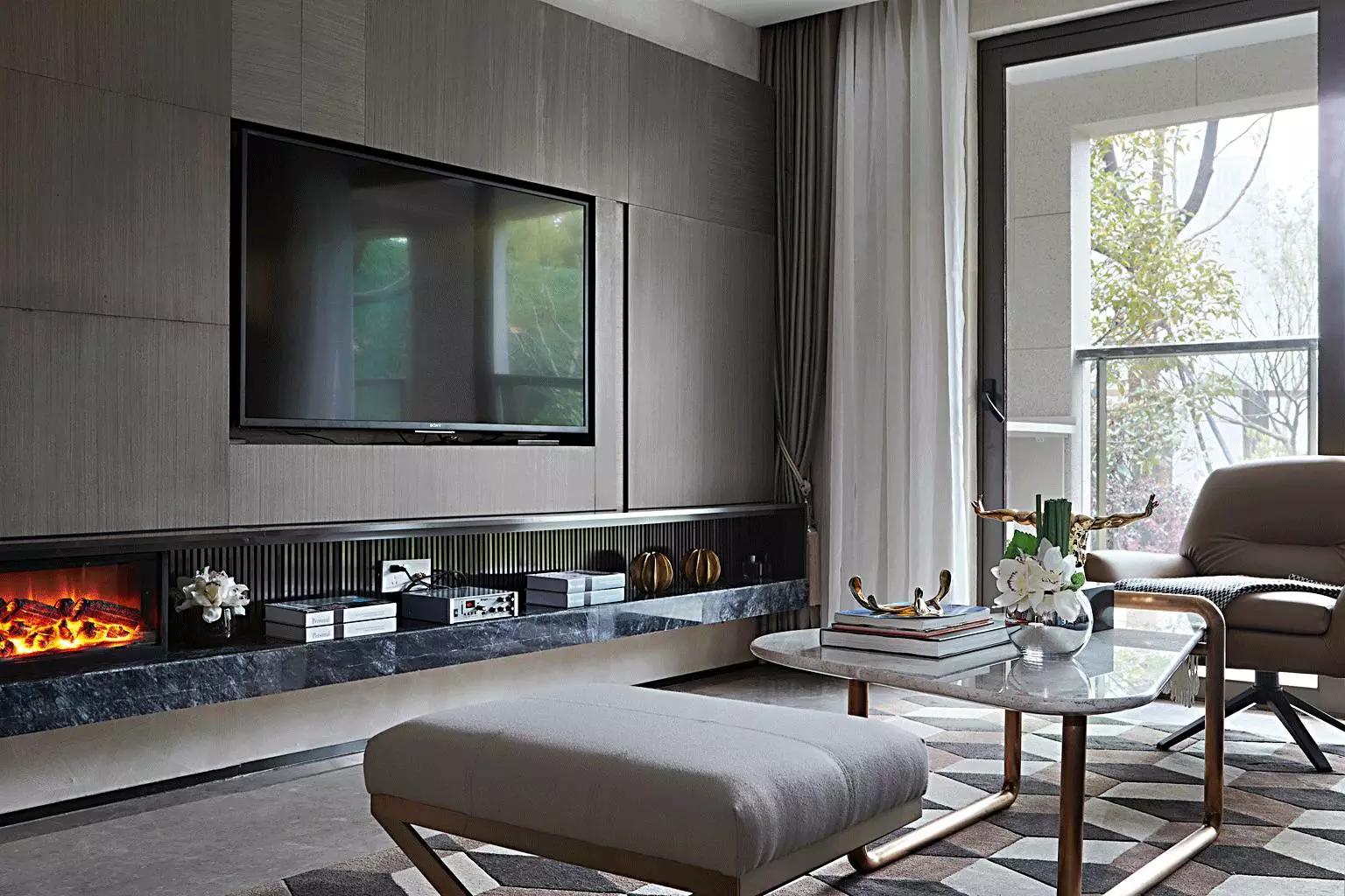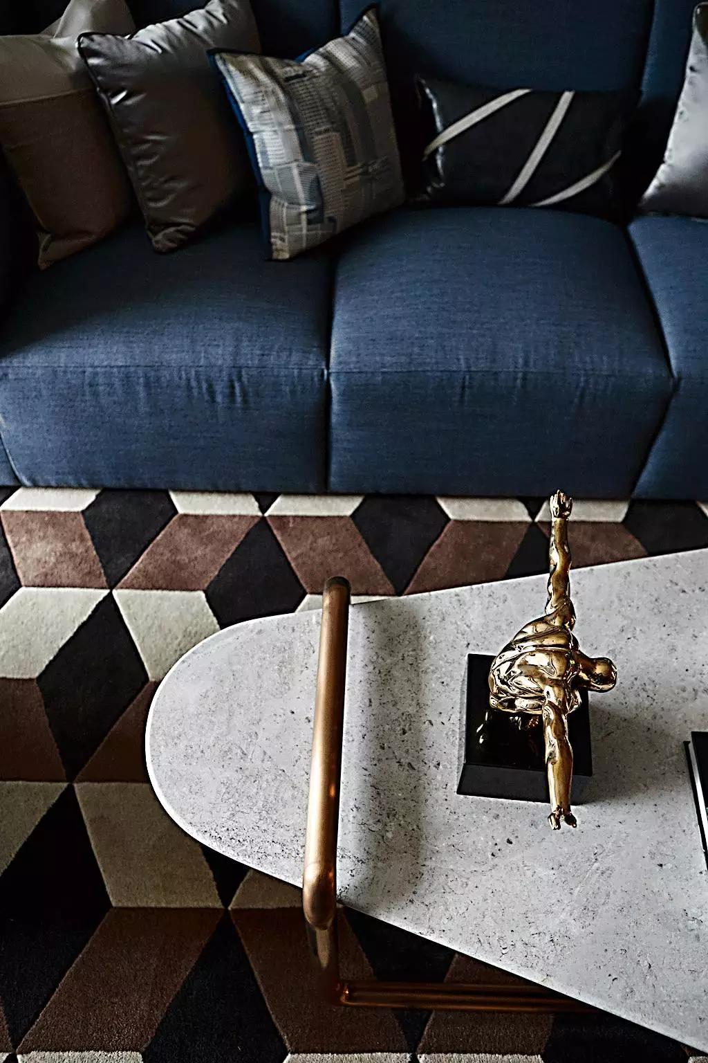 在高級灰的主調(diào)下,任憑灰藍(lán)、灰咖、米灰自由穿梭。金屬與大理石外表下的冷酷質(zhì)感、紡織布藝的溫柔親膚與皮革制品帶有的手工溫度,交纏錯綜,剛?cè)嵯酀?jì)。定制壁爐與優(yōu)雅的Minotti沙發(fā),隱約顯露出居所主人優(yōu)越的品味。