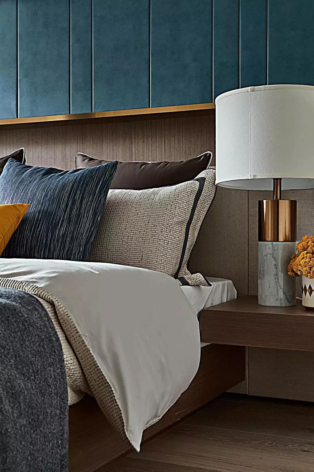 主臥,色彩沉穩(wěn)不失活力,黃銅和皮革造就空間的質(zhì)感,也如同雅痞們的堅毅果敢、躊躇滿志。他們沒有頹廢情緒,一心追求奢侈舒適的生活。