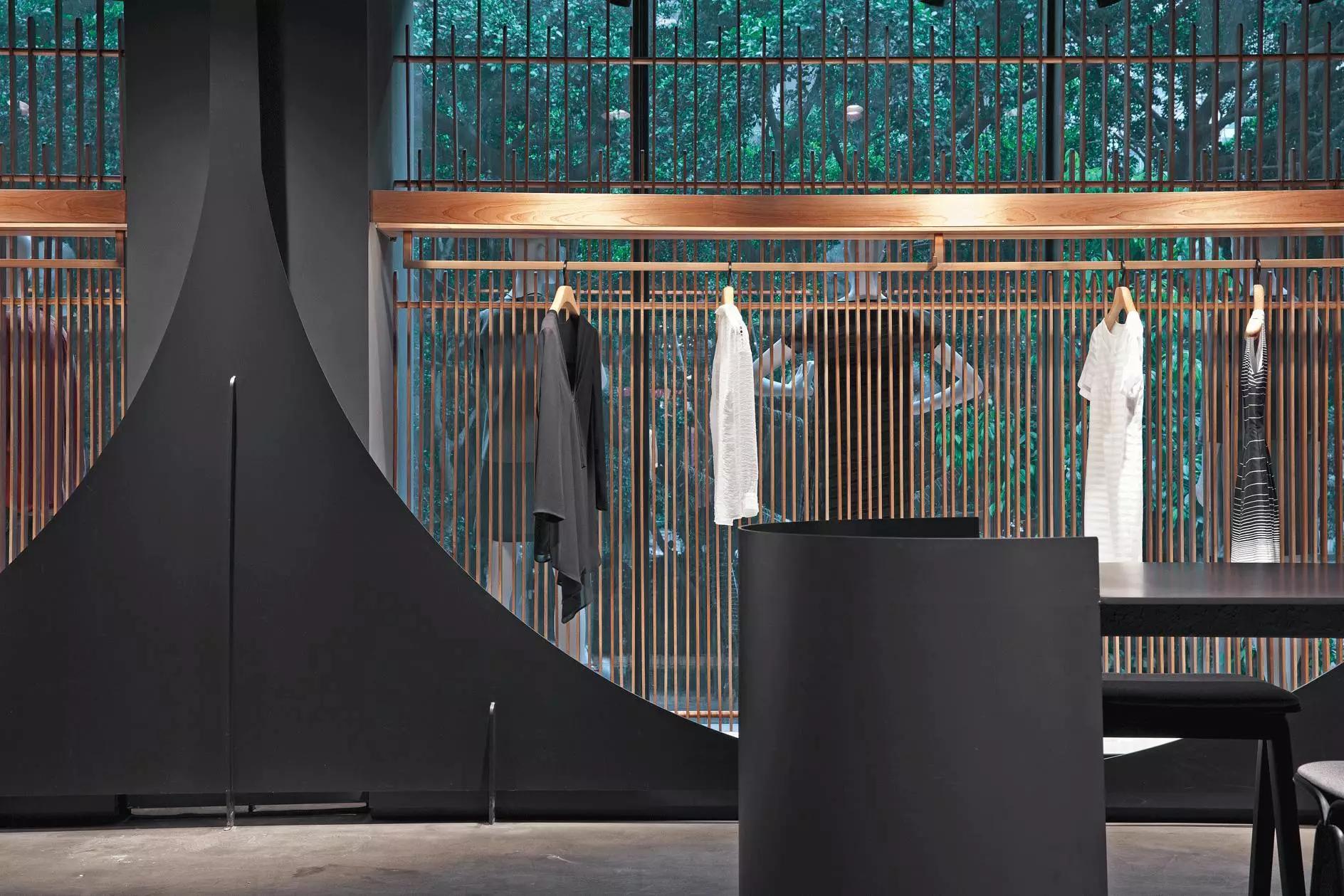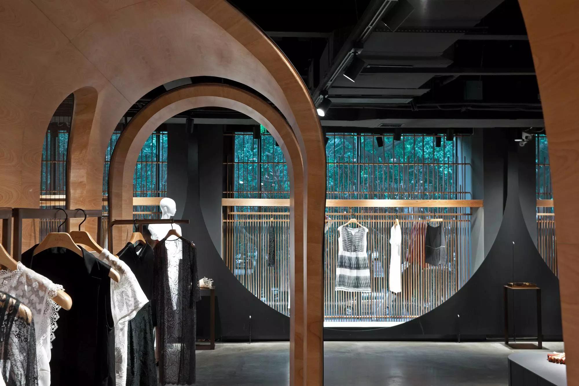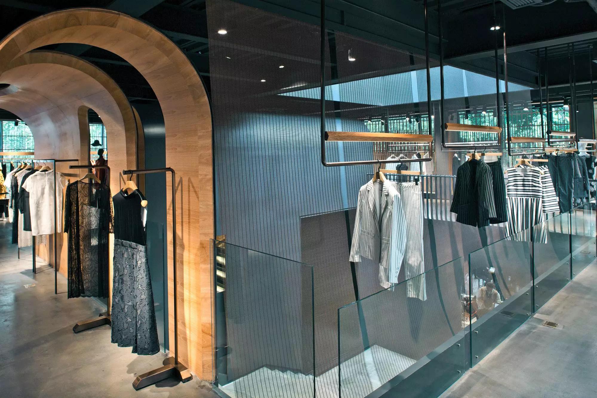 和一般常規(guī)服裝店陳列的概念不同,新的店鋪概念強調(diào)建筑化的零售模式。纖細(xì)的木屏風(fēng)結(jié)合貨架矗立在邊界處,渲染了空間和室內(nèi)飾面的豐富多樣性,建筑元素顯露材質(zhì)原始的質(zhì)感,烘托服裝的品質(zhì),這種手法為整個店鋪灌注純粹的氣氛,隱喻品牌的精神。天井樓梯釋放出不同光影效果,使整個空間與建筑取得一種時間與空間的對話。設(shè)計中,我們直白的將不同的“拱”垂直交疊,希望在垂直空間上制造不同的空間與體驗。這個特殊的表現(xiàn)方式給人們提供強烈的視覺效果。依據(jù)商業(yè)需求,采用模塊式設(shè)計,這樣可以使品牌不同功能具有最大的靈活性。